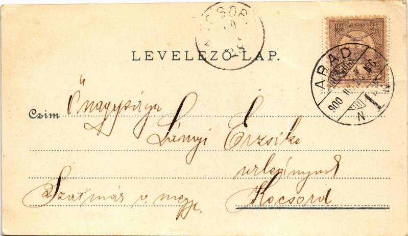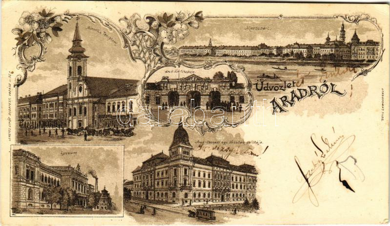 1900 Arad, Minorita templom, vár főkapuja, Maros-part, Lyceum, Arad-Csanádi egy. Vasutak palotája, lóvasút. Lengyel Lipót kiadása / Minorite church, castle gate, Mures riverside, grammar school, railway palace, horse-drawn tram. Art Nouveau, floral, litho (EB)
