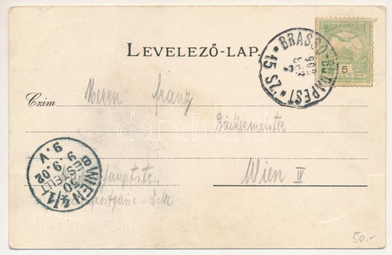 1902 Nagyvárad, Oradea; Bihar vármegye címere, templom. Athenaeum R.T. kőnyomdája / coat of arms, church. Art Nouveau, floral, litho + "BRASSÓ - BUDAPEST 15. SZ." vasúti mozgóposta bélyegző (gyűrődés / crease)