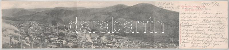 1902 Resicabánya, Resica, Resicza, Resita; vasgyár. Weiss A. kiadása, 3-részes kihajtható panorámalap / iron factory, ironworks. 3-tiled folding panoramacard (hajtásnál kopott / worn at fold)