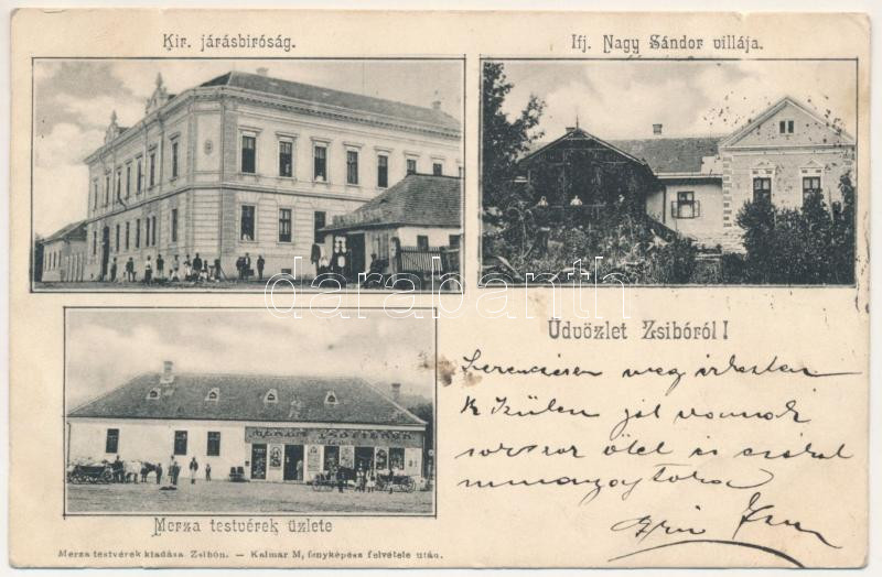 1904 Zsibó, Jibou; Kir. Járásbíróság, Ifj. Nagy Sándor villája, Merza ... https://www.darabanth.com/en/500-Online-auction/500.0/Postcards/Transylvania~2500006/1904-Zsibo-Jibou-Kir-Jarasbirosag-Ifj-Nagy-Sandor-villaja-Merza-Testverek-uzlete-es-sajat~II3410033