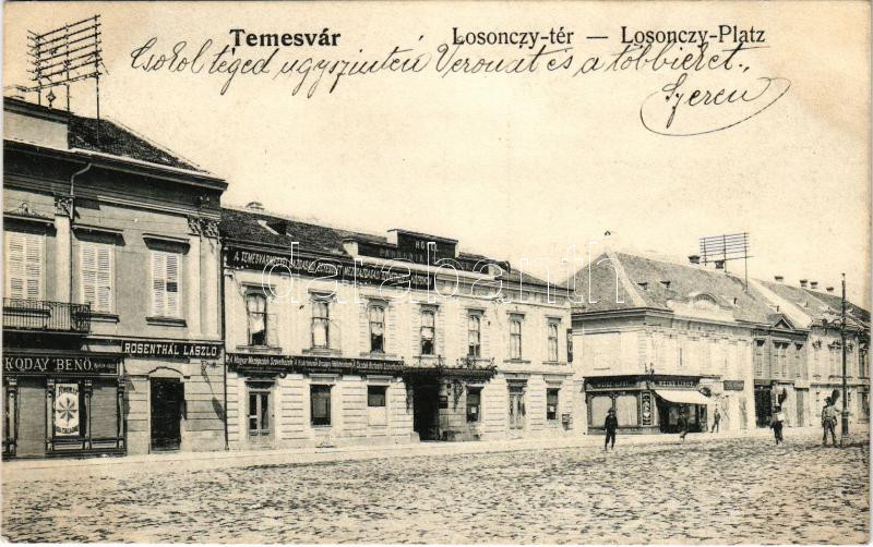 1907 Temesvár, Timisoara; Losonczy tér, Skoday Benő, Rosenthal László és Weisz Lipót üzlete, Pannónia szálloda, Temesvármegyei Gazdasági Egyesület Mezőgazdasági Szövetkezeti Központja / square, shops, hotel, agricultural cooperative center (EK)