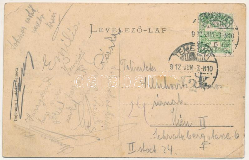 1912 Temesság, Saágh, Sag; Gemeindehaus, Bahnstation, Kirche, General Obert-Villa / községháza, vasútállomás, templom, Obert vezérlak, villa. Dajkovits J. utóda kiadása / town hall, railway station, church, villa. Art Nouveau, floral (apró szakadás / tiny tear)