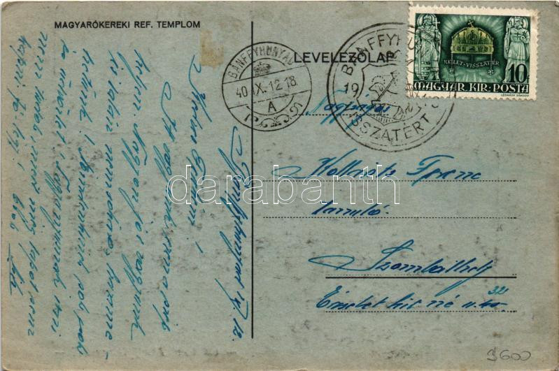 1940 Magyarókereke, Majerou, Alunisu (Bánffyhunyad, Huedin); Magyarókereki református templom / Calvinist church in Alunisu + "1940 Bánffyhunyad visszatért" So. Stpl. (EK)