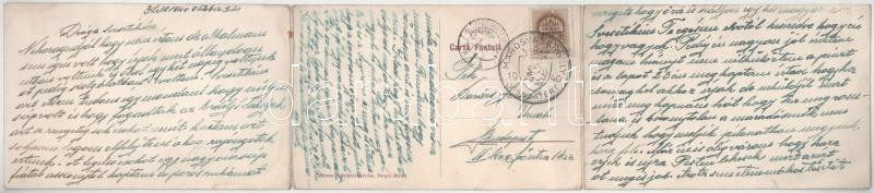 1940 Marosvásárhely, Targu Mures; látkép. Révész kiadása, 3-részes kihajtható panorámalap / general view, 3-tiled folding panoramacard + "1940 Marosvásárhely visszatért" So. Stpl. (hajtásnál szakadás / torn at fold)