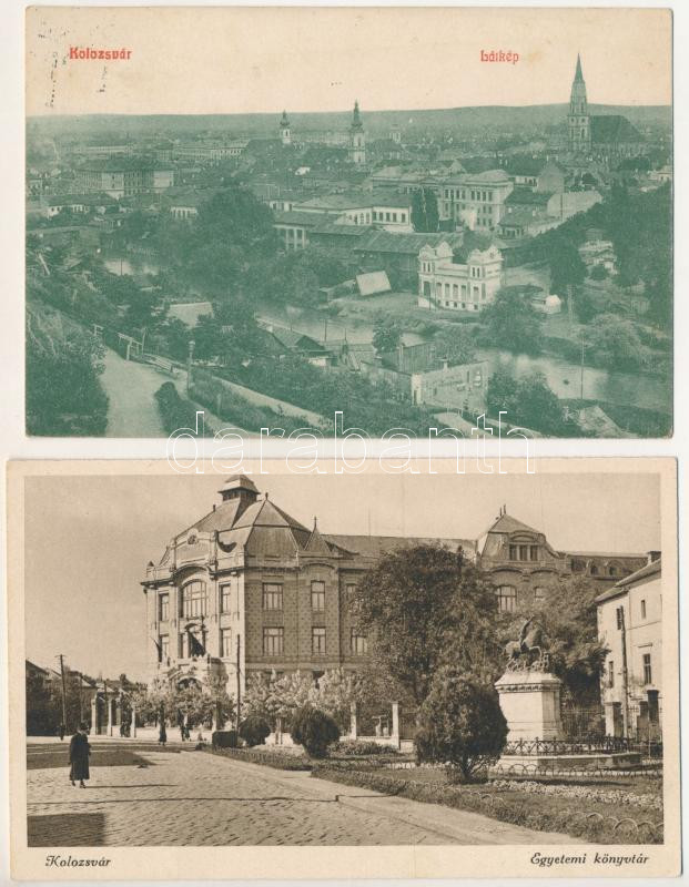 Kolozsvár, Cluj - 2 db RÉGI képeslap: Egyetemi könyvtár, látkép / 2 pre-1945 postcards: university library, general view
