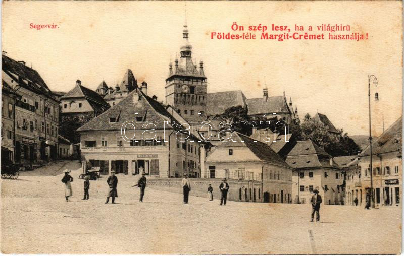 Segesvár, Schässburg, Sighisoara; Girscht és Leonhardt üzlete, óratorony. Földes-féle Margit Creme reklám / shops, clock tower. Hungarian cold cream advertisement (fl)