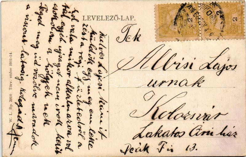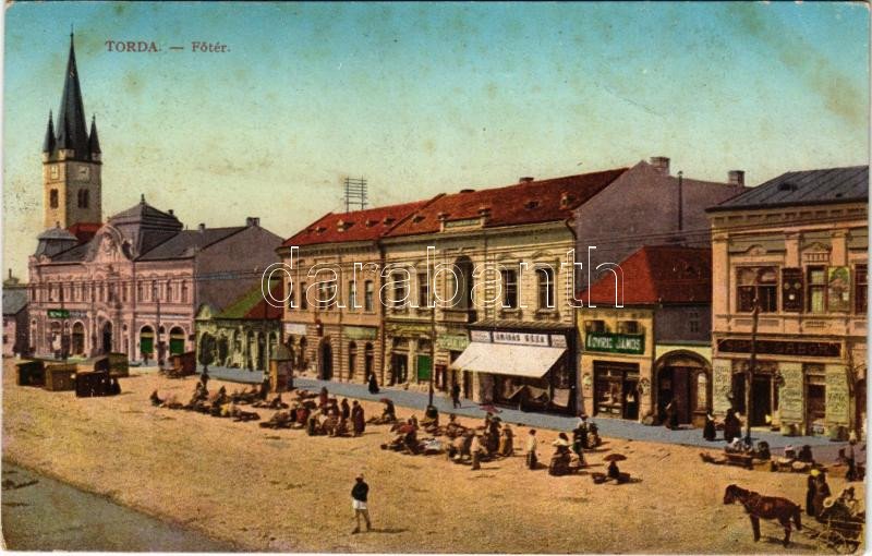Torda, Turda; Fő tér, piac, Sipos Gábor, Kovrig János, Botár Imre és Amirás Géza üzlete. W.L. Bp. 7010. 1911-14. / main square, shops, market (fl)