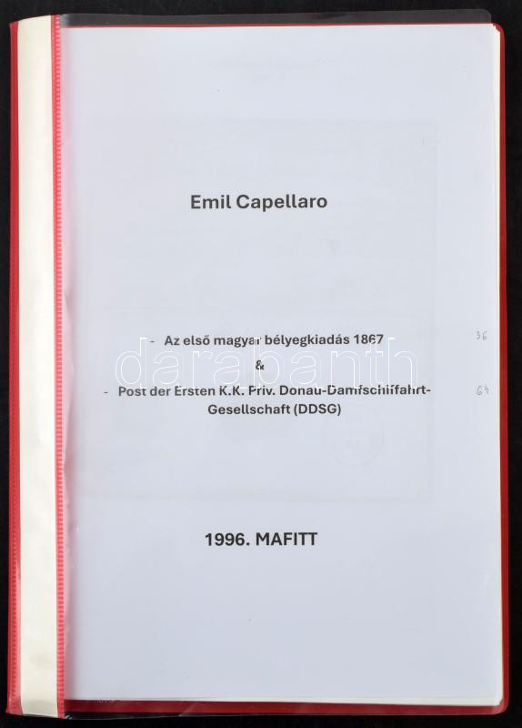Emil Capellaro: Az első magyar bélyegkiadás 1867 & DDSG, az 1996-os MAFITT kiállítási anyag másolatai 36 + 64 oldalon, lefűzve