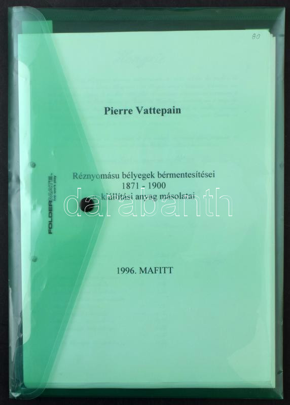 Pierre Vattepain: Réznyomású bélyegek bérmentesítései 1871-1900, az 1996-os MAFITT kiállítási anyag másolatai 80 oldalon, lefűzve