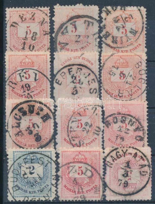 12 db színesszámú krajcáros bélyeg egyenes állású, olvasható bélyegzés...