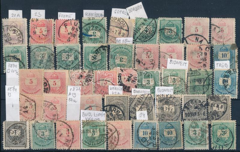 44 db Színesszámú krajcáros bélyeg, köztük sok olvasható bélyegzés is