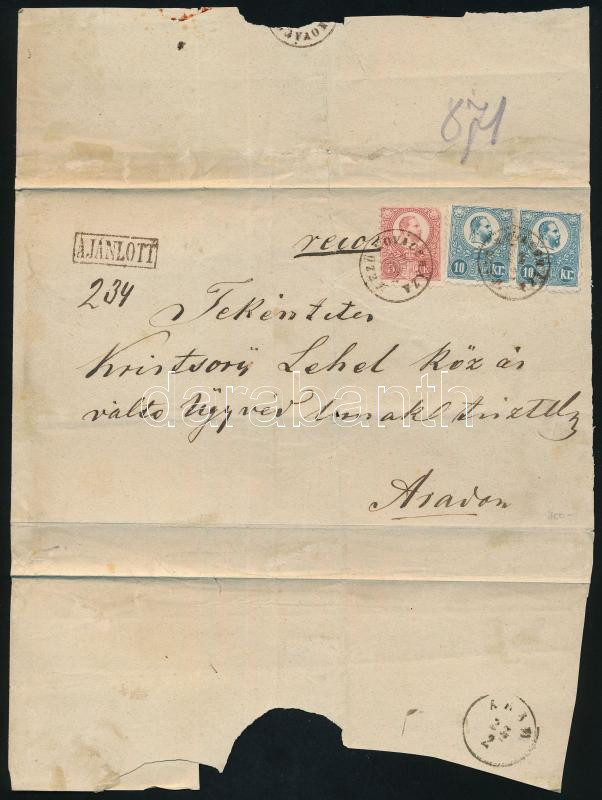 ~1872 Réznyomat 5kr + 2 x 10kr hiányos ajánlott levélen "MEZŐ KOVÁCSHÁZA" - Arad