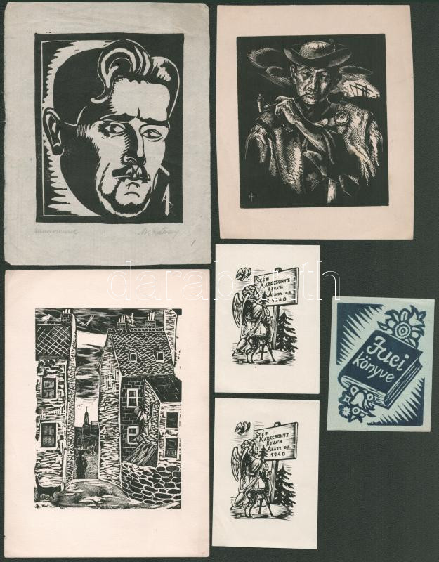 Description: Klf. alkotól (Fery Antal, Menyhárt József stb.): 17 db ex libris és kisgrafika (többségében 1930-40 körül), klf. technikák, papír, részben jelzett, klf. méretekben