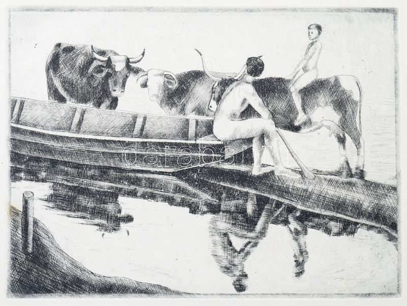 Jelzés nélkül: aktok ökrökön. Rézkarc, papír, 15x19 cm