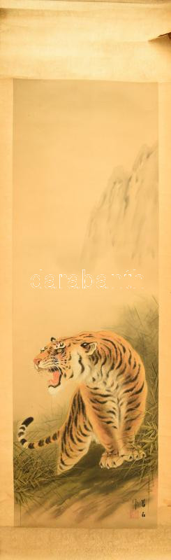 Olvashatatlan jelzéssel, távol-keleti alkotó: Tigris. Akvarell, selyem, papírra kasírozva. Feltekerve. Lapszéli szakadásokkal, gyűrődésekkel. Ábrázolás ép. 126x42 cm