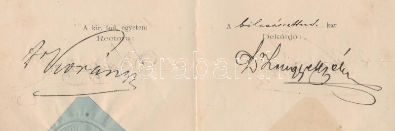 Description: 1886 br. Korányi Frigyes (1827-1913) aláírása Sajó Sándor, született Heringer (1868-1933 költő, tanár, drámaíró, tankerületi királyi főigazgató, az MTA levelező tagja részére kiállított bölcsészkari oklevél