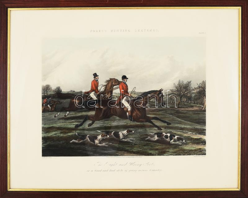 XIX. vége/XX. század első fele: Alken, Henry (1785-1851): Vadászati témájú litográfia, Fores's Hunting Sketches: The Right and Wrong Sort, or a Good and Bad Way of Going Across Country. Plate 1., litográfia, papír, modern üvegezett fakeretben, 36x45 cm, keret: 46x57 cm