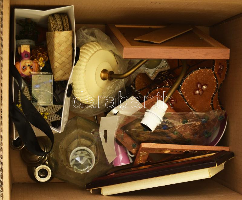 Doboznyi vegyes bolha tétel, közte antik italos üveg, gyertyatartó pár, Uniqua homokkép ajándéktárgy, dekortárgyak.