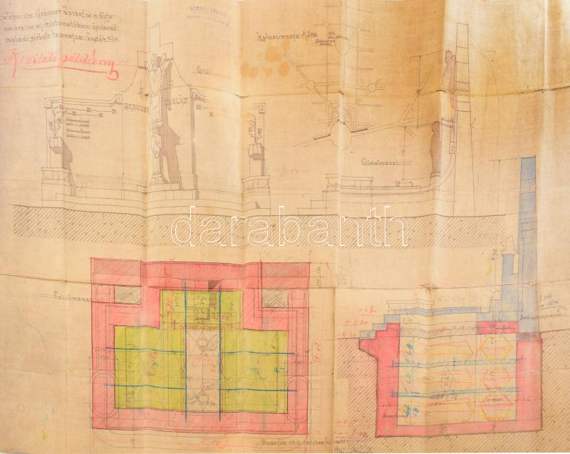 1913 Budafok, Tekintetes Gebauer József úr és neje részére az új köztemetőben építendő családi sírbolt tervrajza, Kiviteli példány, 1 : 20, Werner Károly műépítész jelzett tervrajza, kissé viseltes állapotban, 51x68,5 cm. (Gebauer József (1878-1928), a Ferenc körút és Üllői út sarkán található épületben 1891-től 1909-ig működött kávéház tulajdonosa.)