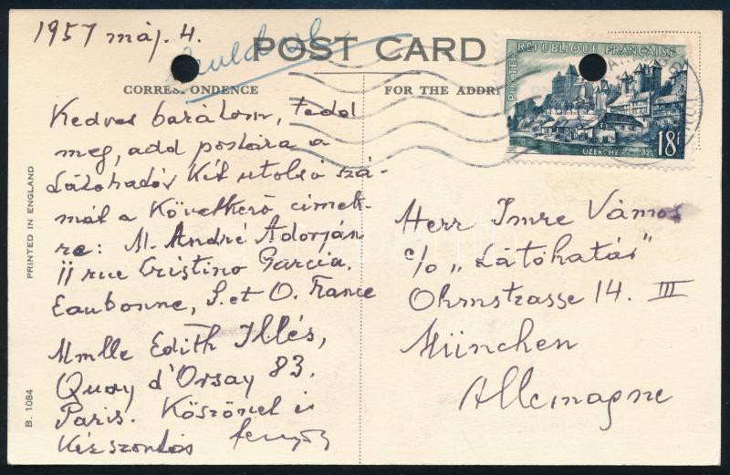1957 Fenyő Miksa (1877-1972) író, a Nyugat alapító főszerkesztője, mecénás autográf képeslapja, aláírásával Vámos Imre (1927-1993) író, újságíró, a Látóhatár szerkesztője részére. "Kedves barátom,..." megszólítással, a Látóhatár példányainak postázása ügyében kát párizsi címre ügyében. Róma, 1957. jún. 3. Lyukasztva.