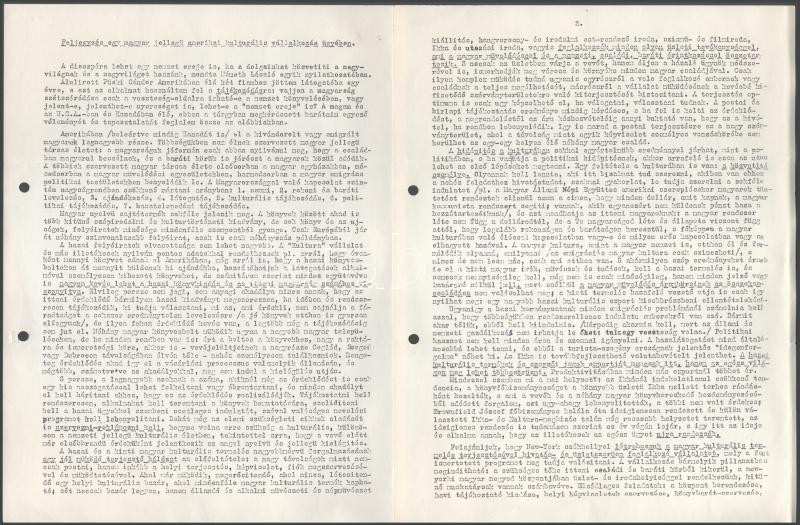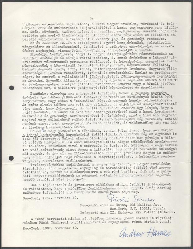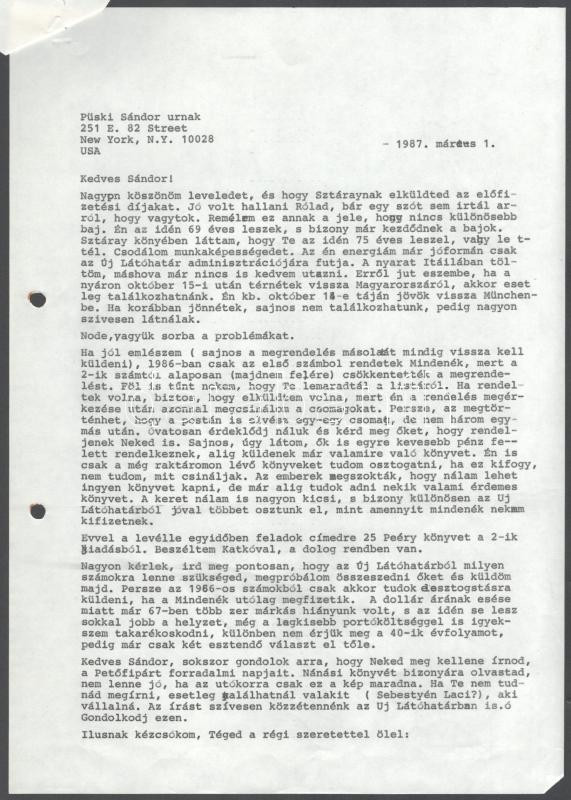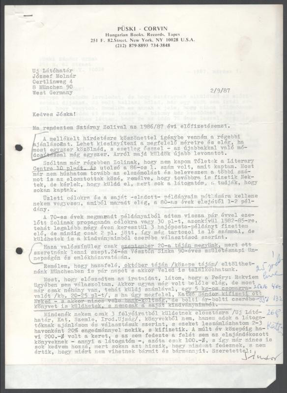 1987 Püski Sándor (1911-2009) könyvkiadó gépelt levele, autográf aláírásával Molnár József (1918-2009) emigráns magyar népi író, folyóirat-szerkesztő, könyvkiadónak, az Új Látóhatár kiadója-szerkesztője részére, fejléces papíron, egy oldal. Hozzá csatolva Molnár József egy oldalas válaszlevelének fénymásolata. A tételhez tartozik "Feljegyzés egy magyar jellegű maerikai kultúrláis vállakozás ügyében" c. memorandum, 3 géppel írt oldal, Püski Sándor és Andrew Hamza autográf aláírásával. Lyukasztva.