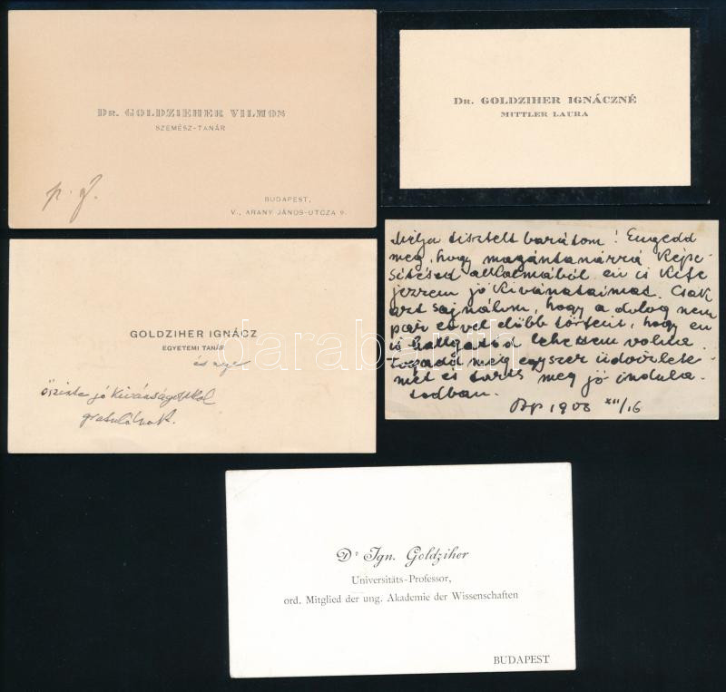 Description: cca 1908 Goldziher Ignác (1850-1921) orientalista, a budapesti izraelita hitközség titkárának és családjának névjegykártyái (2 db, az egyiken autográf bejegyzéssel), közte felesége Dr. Goldziher Ignáczné Mittler Laura, és Goldziher Vilmos (1849-1916) szemészorvos, egyetemi tanár, és egy azonosítatlan személy sorsaival név nélküli kártyán.