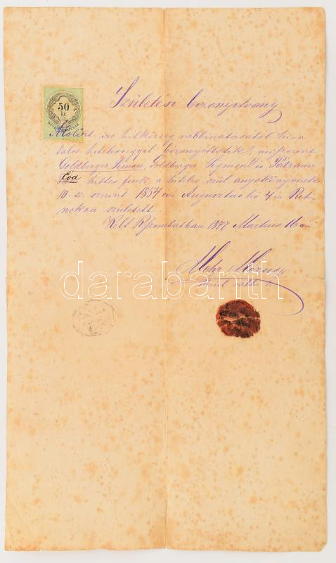 1877 Rimaszombaton kiállított viaszpecsétes születési bizonyítvány Gol...