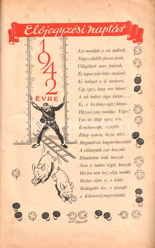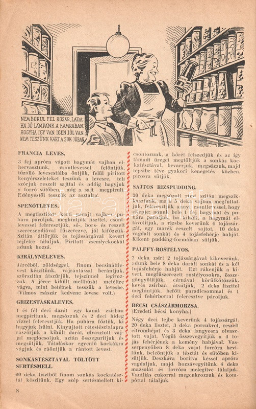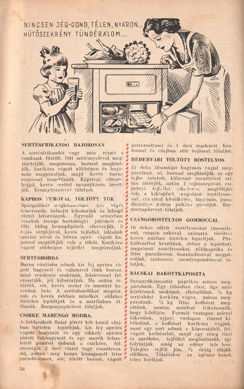 Gönczi Gebhardt Tibor grafikusművész szövegközti rajzaival, karikatúráival gazdagon illusztrált háztartástani és gasztronómiai kalendáriumunk a korábbi évek gyakorlatával szemben elsősorban recepteket közöl, ám Gönczi Gebhardt Tibor oldalpáronként visszatérő grafikái változatlanul különös erővel jelenítik meg a villanyárammal működtetett modern háztartási berendezések kényelmi funkcióit. Kiadványunk így a markáns receptsor mellett felhívja a figyelmet a villanysütők, villamos főzőlapok, hirtelenforralók, villanybojlerek, ventilátorok, hűtőgépek, villanyvasalók, varrógépek, porszívók nélkülözhetetlen mivoltára, beszerzésük sürgős szükségére. Évkönyvünk ismeretterjesztő cikke Ráth-Végh István műve, novellája Bozzay Margittól való.