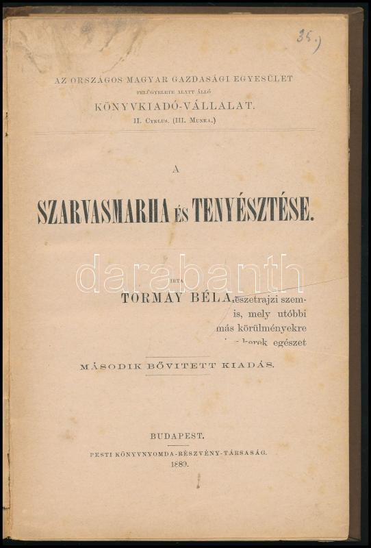 Tormay Béla: A szarvasmarha és tenyésztése. Bp., 1889, Pesti Könyvnyomda Rt., 89+(1) p. Második, bÅ‘vÃtett kiadás. Kiadói egészvászon-kötés, kissé viseltes borÃtóval, helyenként kissé foltos, koszos lapokkal, a cÃmlapon kivágásból eredÅ‘ kisebb hiánnyal.