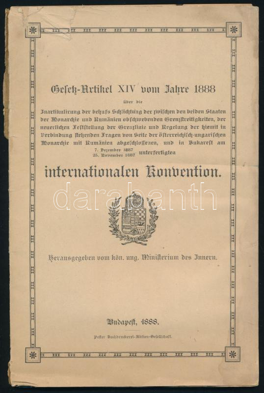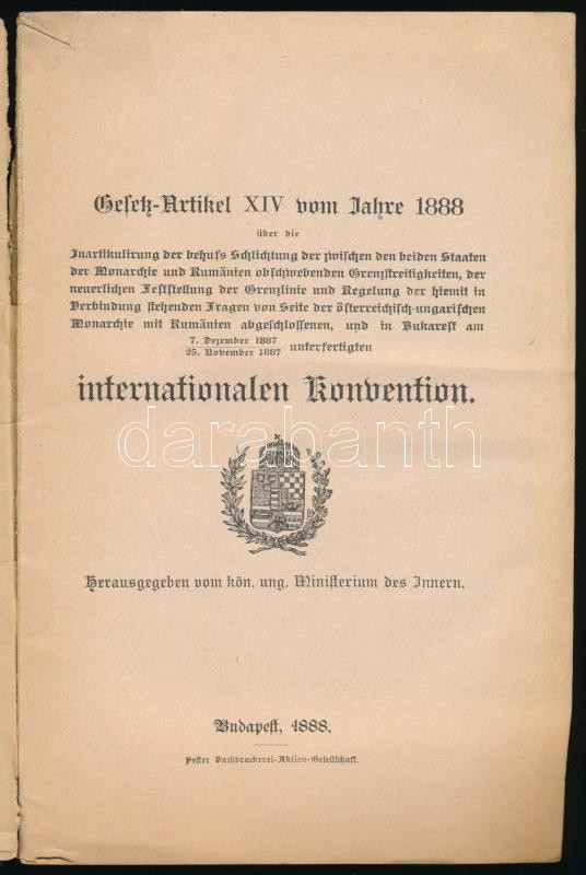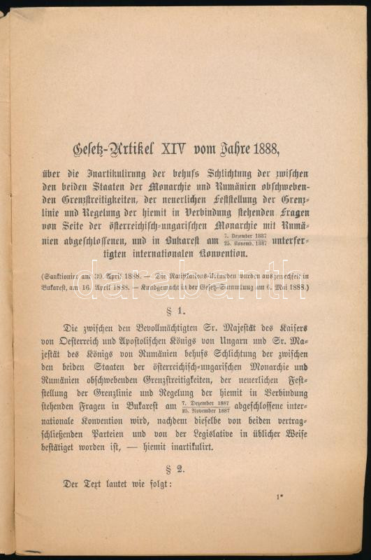 1888 [A Román Királyság és a monarchia közötti határviták rendezéséről szóló egyezményt beiktató törvény német nyelvű kiadása.] Bp., 1888. Pesti Könyvnyomda. 64p. Kiadói papírborítóval. kis sérüléssel