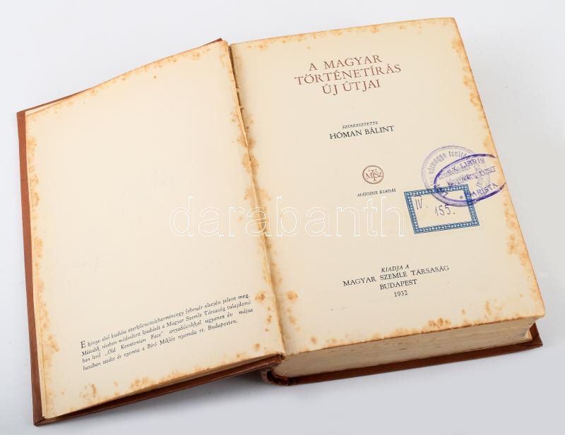 Hóman Bálint (szerk.): A magyar történetÃrás új útjai. A Magyar Szemle Könyvei III. Bp, 1932, Magyar Szemle Társaság, 463+1 p. 2. kiadás. Kiadói aranyozott egészvászon-kötés, régi bélyegzésekkel és a cÃmlapon cÃmkével is, foxing foltos lapokkal.