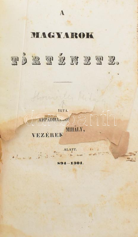 Horváth Mihály: A magyarok története. I-II. köt. [Egybekötve]. I.: A magyarok története az Árpádházból származott vezérek s királyok alatt. 894-1301. II.: A magyarok története az vegyes házakból származott királyok alatt. 1301-1526. [Pápán, 1842-1843, A ref. főiskola betűivel], VII+(1)+175+(1) p.; VIII+(2)+391+(1) p. Első kiadás. Korabeli, aranyozott gerincű félbőr-kötésben, a belső kötéstáblán 1870-es bejegyzéssel, sérült, hiányos címlappal, helyenként foltos lapokkal, intézményi bélyegzővel.