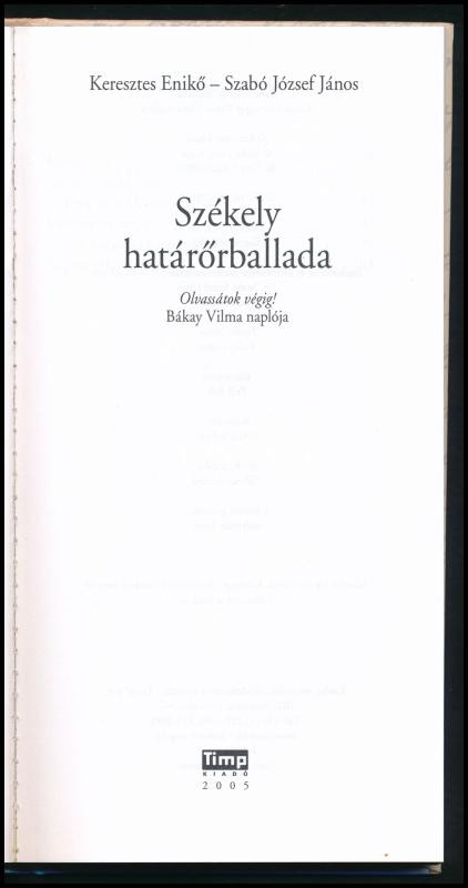 Description: Keresztes Enikő - Szabó József János: Székely határőrballada. Olvassátok végig! Bákay Vilma naplója. Bp., 2005, Timp, 112 p. Kiadói kartonált papírkötés.