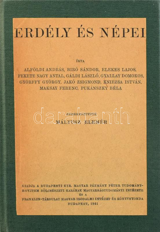 Mályusz Elemér: Erdély népei. Írta: Alföldi András, Biró Sándor, Elekes Lajos, Fekete Nagy Antal, Gáldi László, Gyallay Domokos, Györffy György, Jakó Zsigmond, Kniezsa István, Maksay Ferenc, Pukánszky Béla. Szerk.: - -. Bp., 1941, Budapesti Kir. M. Pázmány Péter Tudományegyetem Bölcsészeti Karának Magyarságtudományi Intézete - Franklin, 254+2 p.+3 t. Átkötött egészvászon-kötés, egy tábla hiánnyal.