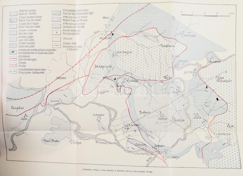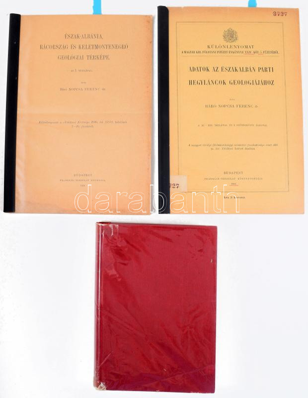 Adatok az északalbán parti hegyláncok geológiájához. Különlenyomat az Magyar Kir. Földtani Intézet évkönyve XXIV. köt. 5. füzetéből. Bp., 1916, Franklin, 3+368-392+2 p.+ XI-XIII (a XI-XII tábla fekete-fehér fotókkal illusztrált, a XIII táblán kihajtható térképpel) t. Modern védőborítóban, benne az eredeti papírborítóval is, régi intézményi bélyegzésekkel, névbejegyzéssel.;