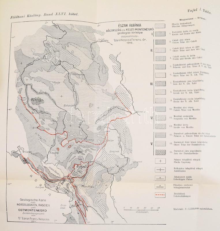 Észak-Albánia, Rácország és Keletmontenegró geológiai térképe. Különlenyomat a "Földtani Közlöny" 1916. évi XLVI. kötetének 7-12. füzetéből. Bp., 1916, Franklin, 227-231 p. + 1 t. Modern védőborítóban, benne az eredeti papírborítóval is.;