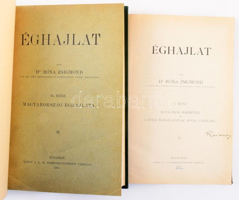 Róna Zsigmond: Éghajlat. I-II. rész. I. rész: Általános ismeretek és a föld éghajlatának rövid vázolása. II. rész.: Magyarország éghajlata. Bp., 1907-1909., K. M. Természettudományi Társulat, IX+1+265+3 p.; IX+696+1 p. Az I. kötet átkötött félvászon-kötésben, kopott borítóval, a II. kötet átkötött modern egészműbőr-kötés, benne bekötött papírborítóval, mindkét kötetben névbejegyzésekkel, az I. kötetben aláhúzásokkal.