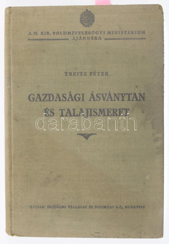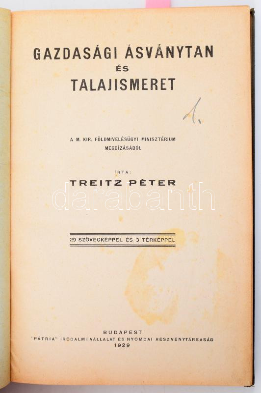 Treitz Péter: Gazdasági ásványtan és talajismeret. Bp., 1929, "Pátria", 237+(1) p.+ 1 (kihajtható térkép, Csonka-Magyarország talajtérképe, 38x54 cm) t. Egyetlen kiadás. Kiadói egészvászon-kötés, kissé foltos borítóval, helyenként kissé foltos lapokkal, a térképen kisebb szakadással.
