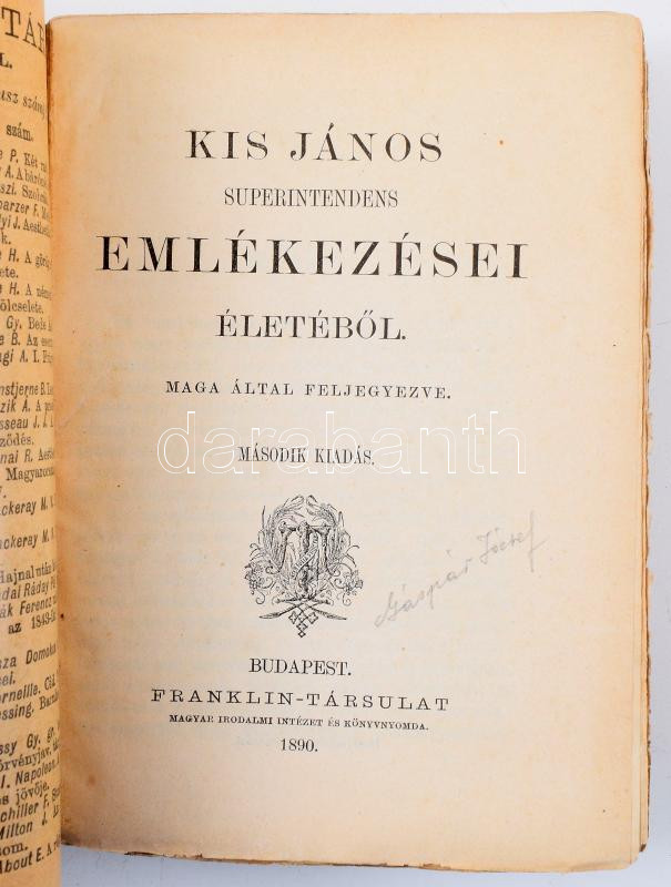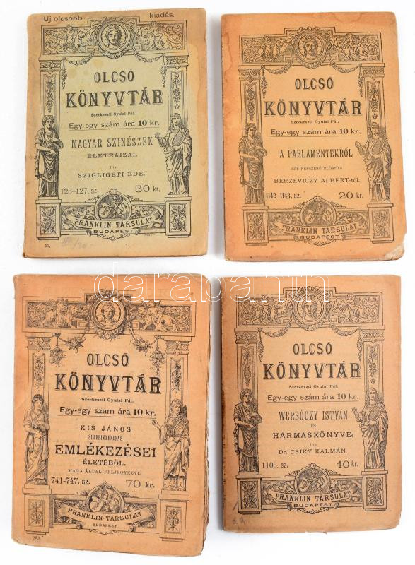 Description: Az Olcsó Könyvtár sorozat 4 kötete: Berzeviczy Albert: A parlamentekről. Két népszerű előadás.; Szigligeti Ede: Magyar színészek életrajzai.; Csiky Kálmán: Werbőczy István és Hármaskönyve.; Kis János superintendens emlékezései életéből. Bp., 1878-1900, Franklin-Társulat. Kiadói papírkötés, változó állapotban, részben kissé sérült, foltos.