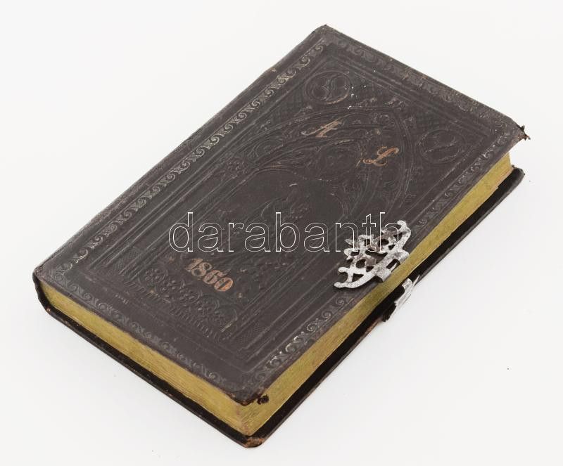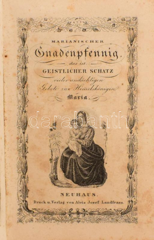 Marianischer Gnadenpfennig, das ist, Geistlicher Schatz vieler andächtigen Gebete zur Himmelskönigin Maria. Neuhaus,(1855),Alois Landfrass, 252+4 p. Német nyelven. Korabeli egészbőr-kötés, az elülső borítón "Mária a kisded", A. L. monogram, valamint 1860-as évszám, fém kapoccsal, kopott borítóval, foltos címképpel és címlappal.