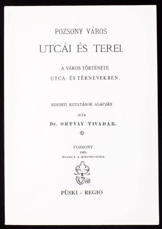 Description: Ortvay Tivadar: Pozsony város utcái és terei. A város története utca- és térnevekben. Szabó Lilla utószavával. Regio Könyvek - VI. Pozsonyi Könyvtár. Bp., 1991, Püski-Regio, 668 p. Az 1905-ös kiadás reprint kiadása. Kiadói papírkötés, jó állapotban.