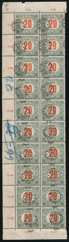 Nagyvárad 1919 Portó 20f ívsarki 20-as tömb elcsúszott felülnyomással, Bodor vizsgálójellel (ceruzás írás, rozsdafoltok / pencil writing, stain spots)