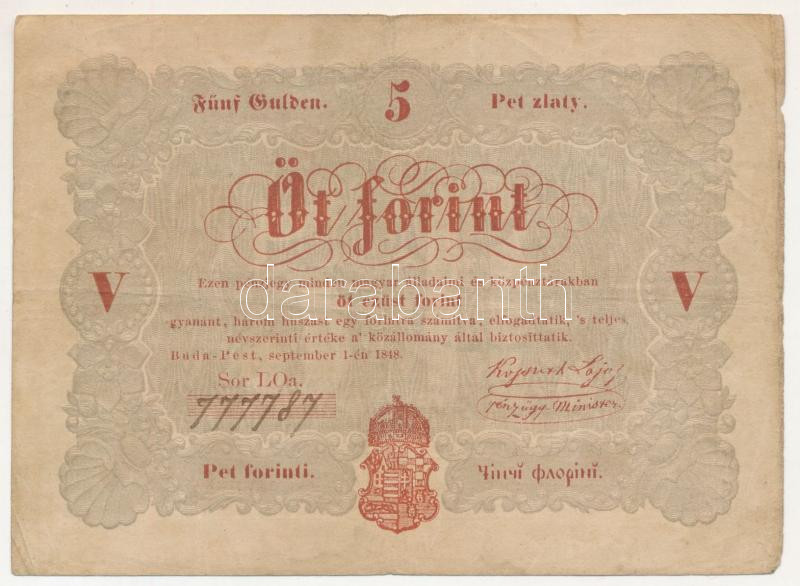1848. 5Ft vörösesbarna nyomat "LOa. 777787" "Kossuth bankó" T:F