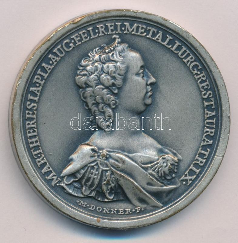 Description: 1960-1970 k. "Selmecbányai Bányászati Akadémia - bányaművelés" Matthäus Donner emlékérméjének utánverete, ezüstpatinázott bronz jutalomérem. "METALLI FODINARUM CULTURAE STUDIUM PRAEMIAT / MAR THERESIA PIA AUG FEL REI METALLURG RESTAURATRIX " (45mm) T:XF