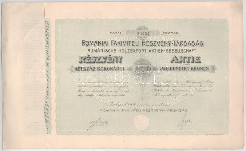 1908 Budapest "Romániai Fakiviteli Részvénytársaság" részvénye 200K-ró... https://www.darabanth.com/en/502-Online-auction/502.0/Numismatics/Shares-and-Tickets~75/1908-Budapest-Romaniai-Fakiviteli-Reszvenytarsasag-reszvenye-200K-rol-szarazpecsettel-es~II3412132