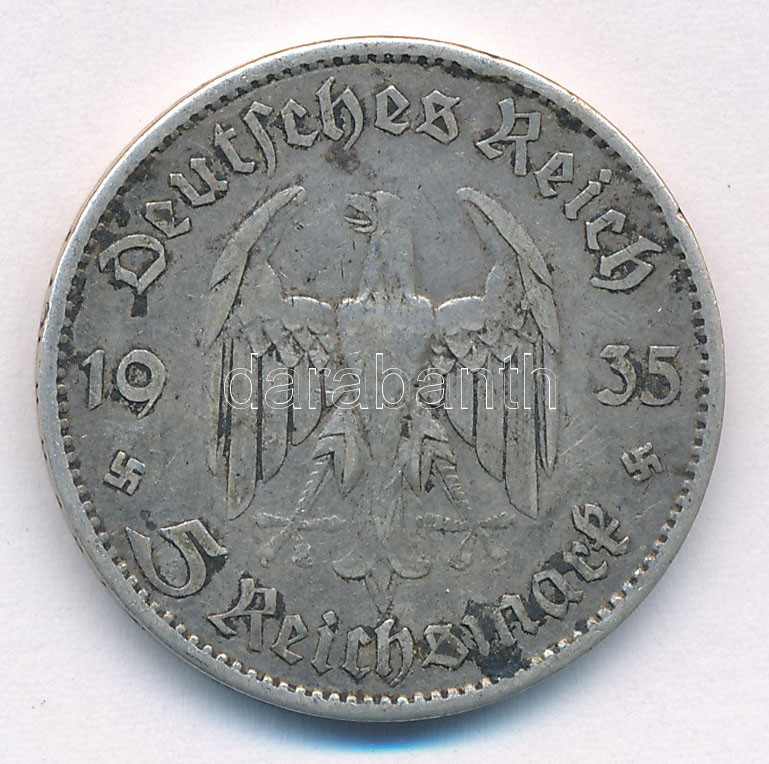 https://www.darabanth.com/en/502-Online-auction/502.0/Numismatics/Worldwide-silver-and-metal-coins~85/Nemet-Harmadik-Birodalom-1935A-5M-Ag-Garnisonkirche-T2-patina-German-Third-Reich-1935A-5-Reichs~II2789425