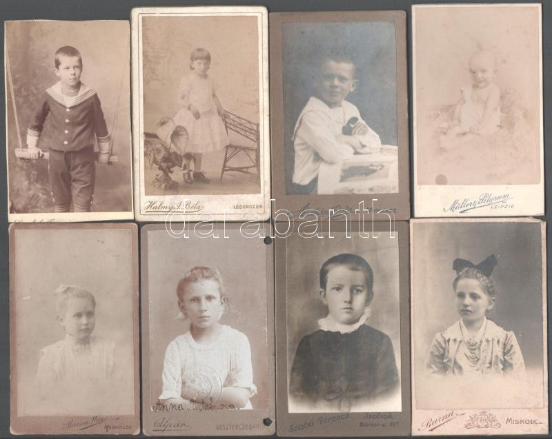 Description: 8 db gyerekeket ábrázoló vizitkártya, különféle műtermekből (közte Halmy J. Béla, Losonc; Alpár Henrik, Besztercebánya; Szabó Ferenc, Szolnok; stb.), változó állapotban