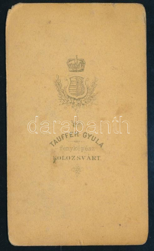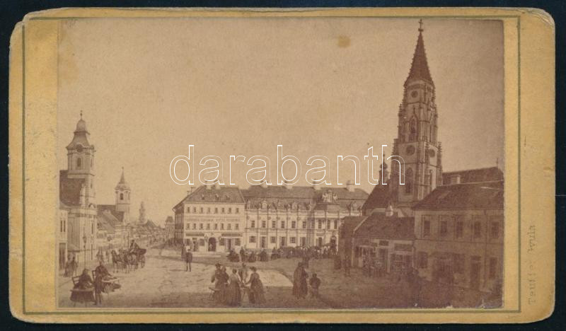 Description: cca 1865 Kolozsvár (Cluj), látkép a Szent Mihály-templommal és a Pannonia szállodával, keményhátú fotó Tauffer Gyula kolozsvári műterméből, kissé foltos, egyik sarka kissé sérült, 6x10,5 cm