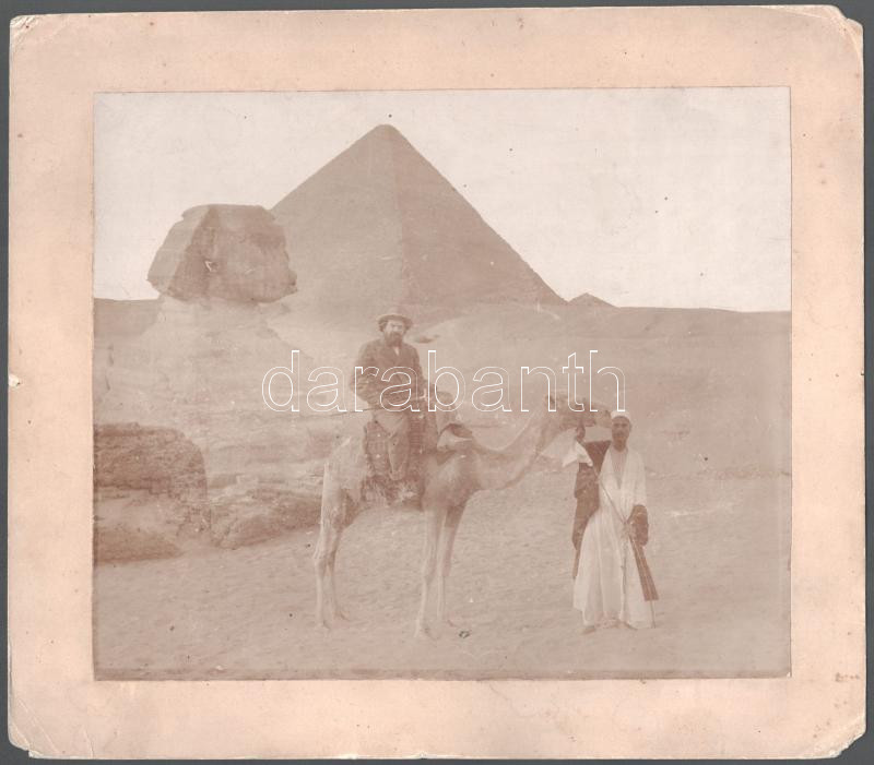 cca 1890 Egyiptom, teveháton utazó férfi a gízai nagy piramis (Hufu-piramis vagy Kheopsz-piramis) és szfinx előtt (a hátoldali felirat szerint Popovics Sándor (Alexandru Popovici) (1836-1903) herkulesfürdői orvos, igazgató), nagyméretű fotó kartonon, a hátoldalon ceruzával írt feliratokkal, a karton szélein kis sérülésekkel, foltokkal, 20x23,5 cm, karton: 25x29 cm