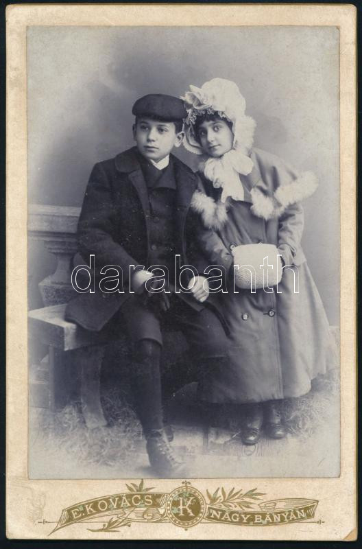 cca 1908 Moldován testvérek téli öltözetben, keményhátú fotó Kováts El...